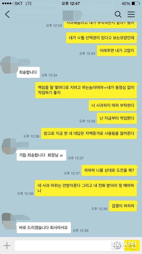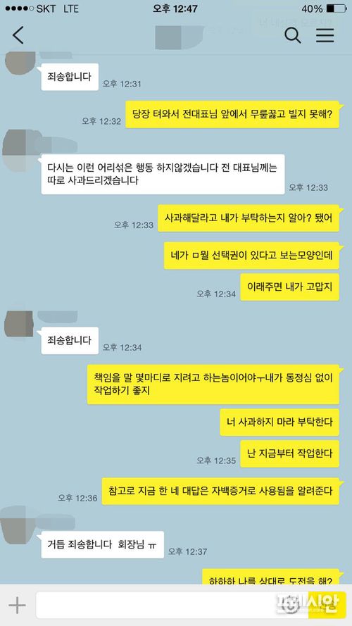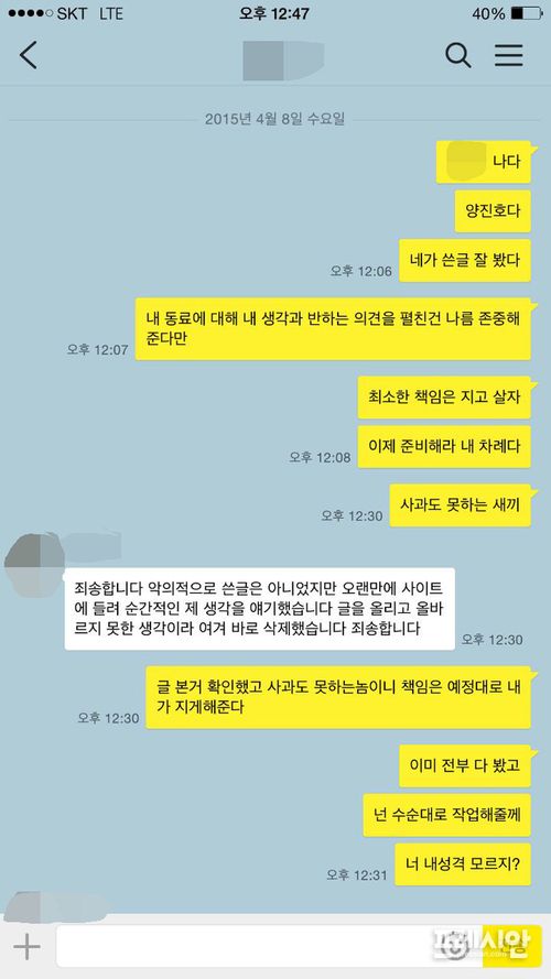 당일 정오 무렵 양진호는 해당 전 직원에게 "양진호다. 네가 쓴 글 잘 봤다. 넌 수순대로 작업해줄게. 너 내 성격 모르지? 너 사과하지 마라. 난 지금부터 작업한다", "하하하 나를 상대로 도전을 해? 겁쟁이 하하하" 등의 메시지를 카카오톡으로 보냈다.